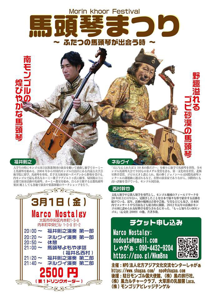 しゃがぁ 各種イベント申込フォーム京都在住の馬頭琴&ホーミー奏者の福井則之氏とモンゴル国ゴビ砂漠在住ゴビの天才ネルグイ氏のふたりによる馬頭琴イベント!